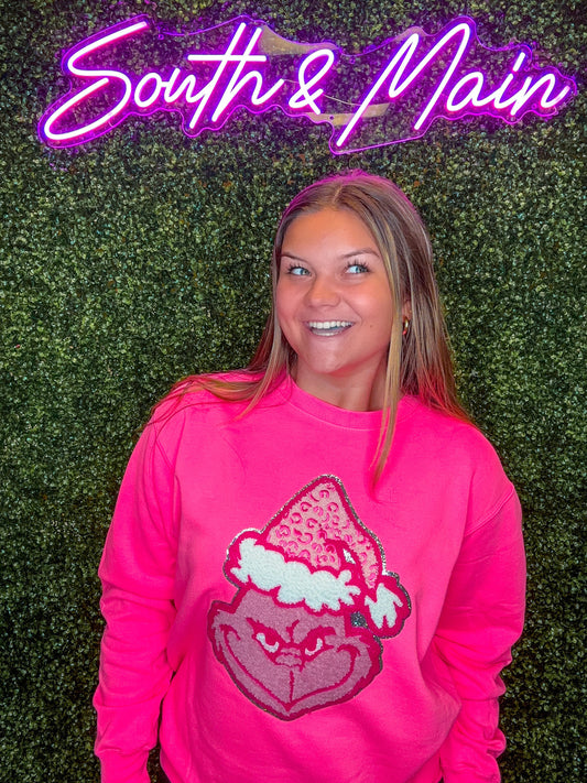 Hot Pink GRINCHY Chenille Sweatshirt - Light Pink