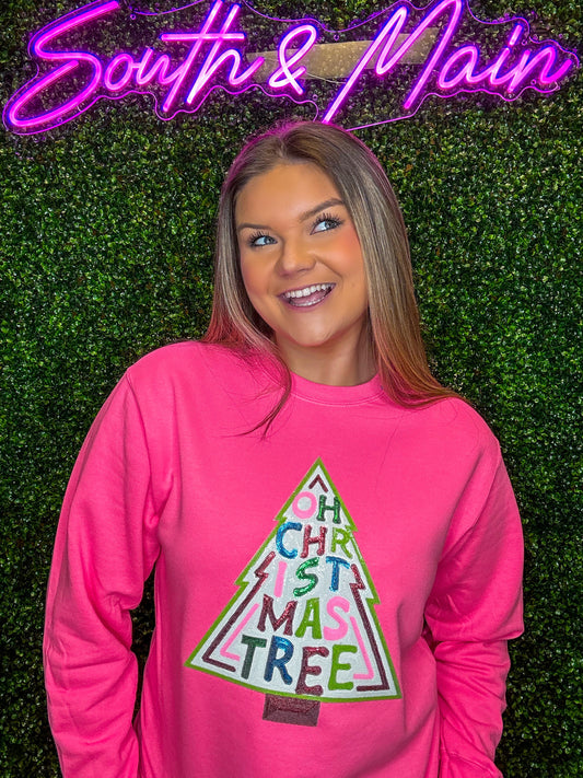 Oh Christmas Tree Sequin Sweatshirt - Bright Pink