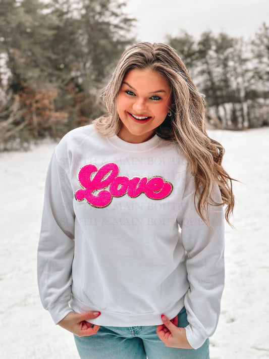 LOVE Hot Pink Chenille Sweatshirt - White