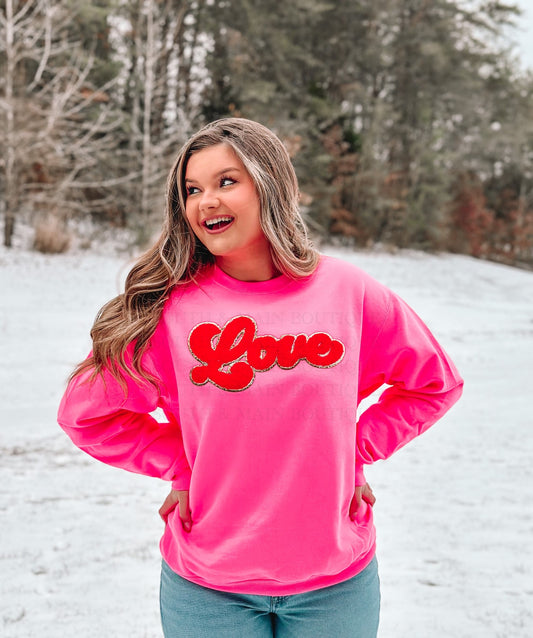 LOVE Red Chenille Sweatshirt (Bright Pink)