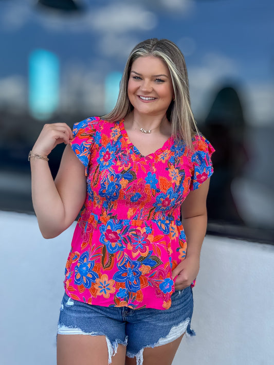 Bright Floral Smocked V-Neck Top